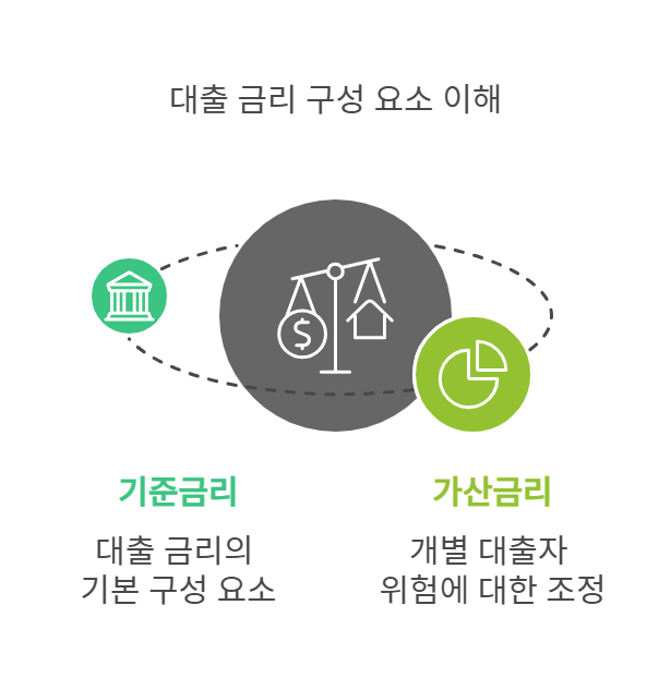 금융 거래에서 대출 금리는 보통 기준금리와 가산금리로 구성됩니다. 기준금리는 한국은행의 기준금리나 시장에서 결정되는 금융기관 간 거래 금리를 바탕으로 설정됩니다. 이는 대출이나 예금 상품의 기본이 되는 금리입니다.