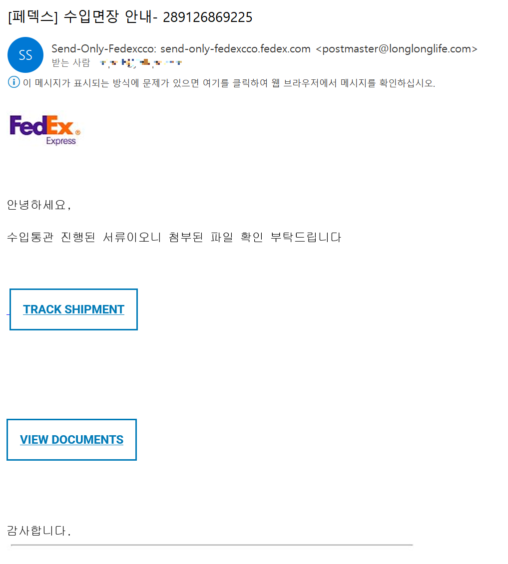최근 접수된 가짜 FedEx 메일을 분석해보면 다음과 같은 특징들이 나타납니다: