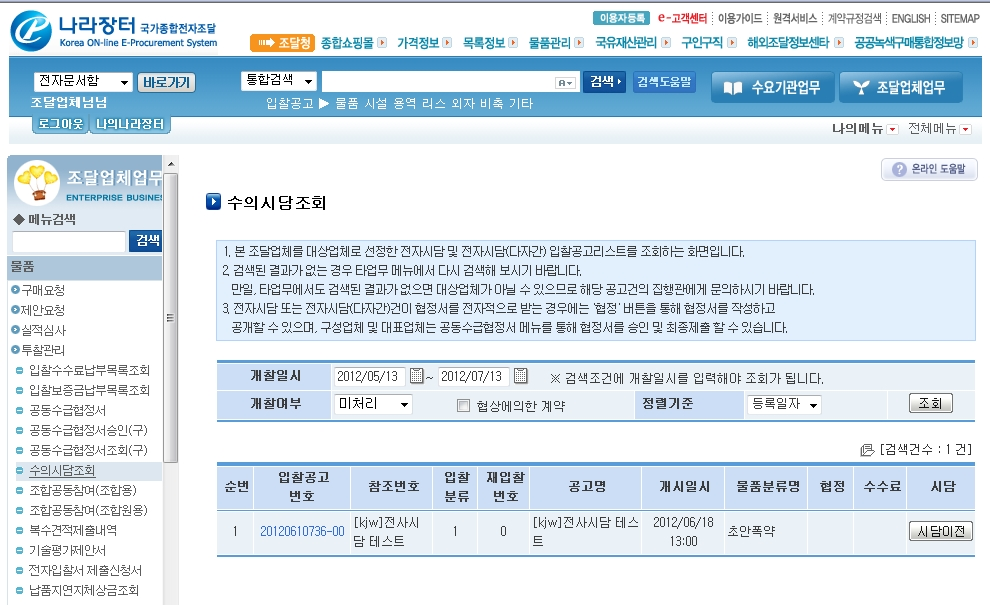 - 조달업체업무 > 물품/시설/용역 > 투찰관리 > 수의시담조회
