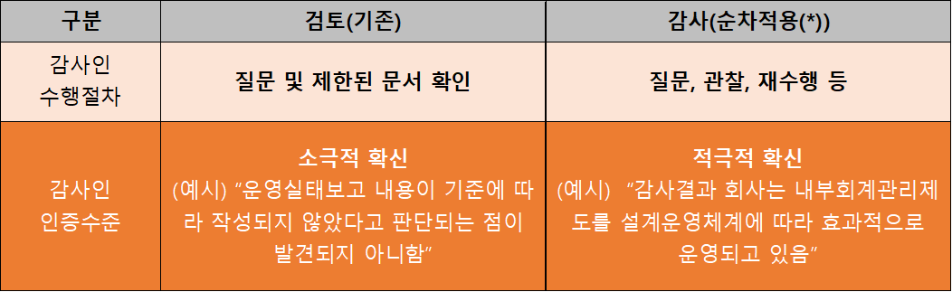 - 주식회사 등의 외부감사에 관한 법률의 개정에 따라, 상장법인의 외부감사인이 회사의 내부회계관리제도와 관련된 외감법의 준수 여부 및 회사의 내부회계관리제동의 운영실태에 관한 보고내용을 확인하고 감사보고서에 표명하여야 하는 종합의견의 수준이 "검토"에서 "감사" 상향됨