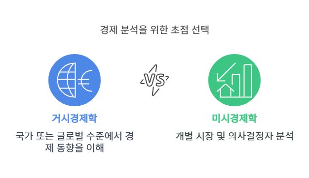 | 핵심 주제 | GDP, 물가, 실업률, 금리, 환율, 무역, 정부 및 중앙은행 정책 등 | 가격 결정 메커니즘, 생산·소비 이론, 시장 구조, 기업 전략, 소비자 행동 등 |