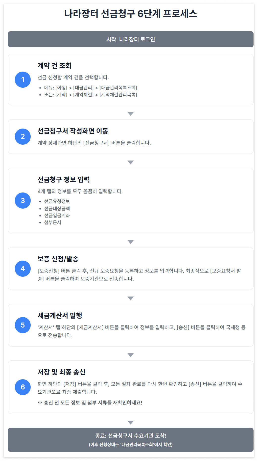 특히 청구 정보 입력, 선금 보증 신청 및 보증요청서 발송, 그리고 세금계산서 발행 및 송신 - 이 세 가지 절차를 모두 완료해야 선금청구서 송신이 가능하다는 점을 항상 기억하세요!